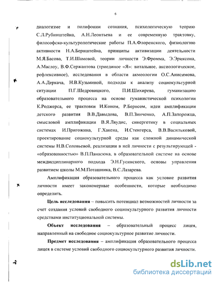 Предмет исследования - амплификация образовательного процесса лицея в системе условий свободного социокультурного развития личности.