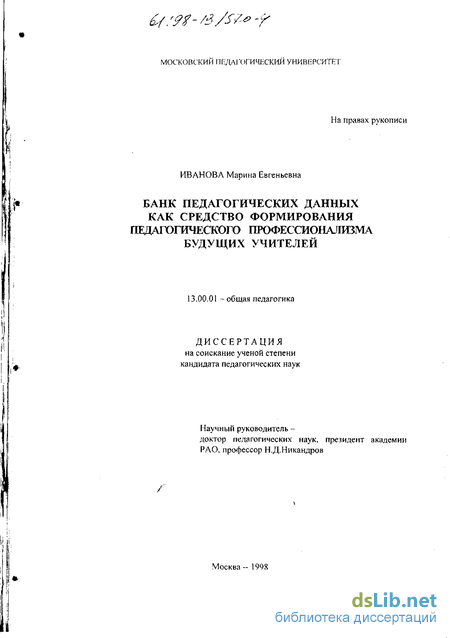 товку учителя. Активная работа в направлении использования компьютеров в преподавании педагогики ведется на кафедре педагогики МПУ, где создан и функционирует компьютерный Банк педагогических данных (банк педагогических данных - автоматизированная система сбора, обработки, накопления, хранения, распространения педагогических данных). Сделано немало, но остается много нерешенных проблем. В частности, не выявлены педагогические условия эффективного использования существующих технологий работы БПД, дальнейшего их развития. Решение этой проблемы составляет цель исследования.