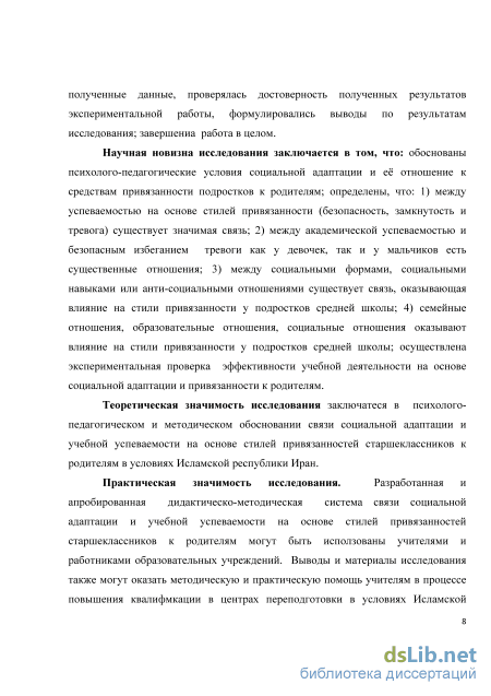 Практическая значимость исследования. Разработанная и апробированная дидактико-методическая система связи социальной адаптации и учебной успеваемости на основе стилей привязанности старшеклассников к родителям может быть использована учителями и работниками образовательных учреждений. Выводы и материалы исследования также могут оказать методическую и практическую помощь учителям в процессе повышения квалификации в центрах переподготовки в условиях Исламской Республики Иран, а также в процессе взаимосвязанной работы средних образовательных учреждений с родителями школьников.