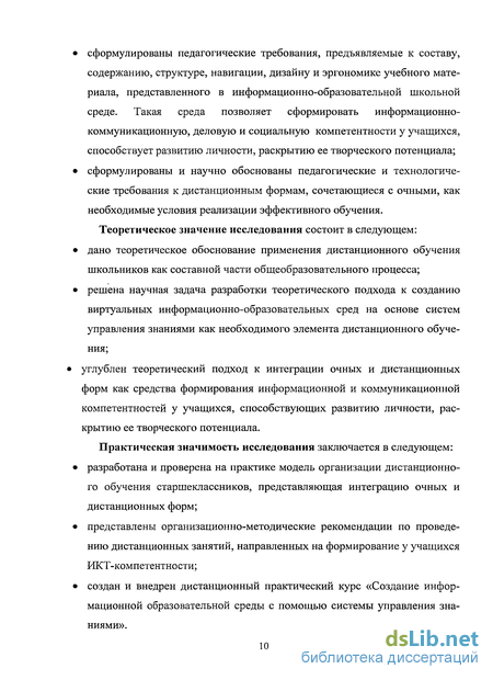 • дано теоретическое обоснование применения дистанционного обучения школьников как составной части общеобразовательного процесса;
