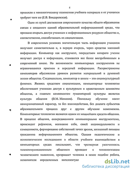 массовой информации. Компьютер как инструмент, посредством которого ученик получает доступ к информации, становится все более востребованным в современной школе. Но возможности компьютерных инструментов не ограничиваются приемом и передачей информации. Распространение компьютеров обусловлено уровнем развития материальной и духовной жизни общества. Следовательно, компьютер в школе - это социокультурный феномен. Являясь средством социализации, компьютерные технологии обеспечивают ученикам доступ к культурным и нравственным ценностям общества, а главным компонентом гуманитарной культуры является культура общения (В. М. Монахов). При общении посредством компьютерных технологий происходит рефлексия, осознание себя, своей индивидуальности и самоценности, формирование собственной точки зрения, жизненной позиции гражданина информационного общества. Однако педагогические и психологические исследования в области учебного взаимодействия в компьютерных средах показывают, что чрезмерная увлеченность телекоммуникационным общением приводит к технологизации человеческого мышления, превращает человека в некое подобие робота, исполнителя определенных интеллектуальных функций (А. Крылов); постепенному угасанию роли эмоций в традиционном общении (Ю. Д. Бабаева, А. Е. Войскунский). Подавление сферы непосредственного межличностного взаимодействия препятствует профессиональному самоопределению (В. Фриндте, Т. Келер); ограничивает реальные социальные контакты, вызывает потерю интереса к реальному общению (К. Е. Кузьмина); приводит к изменению полоролевого компонента социализации, деперсонификации общения; возникновению анимизма как следствия боязни компьютера; аутизации — уходу от действительности.