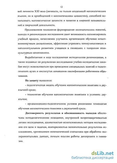 Практическая значимость диссертации заключается в том, что использование результатов исследования в процессе обучения учащихся математическим понятиям в гимназиях с татарским этнокультурным компонентом позволяет успешно решать вопросы формирования языко-