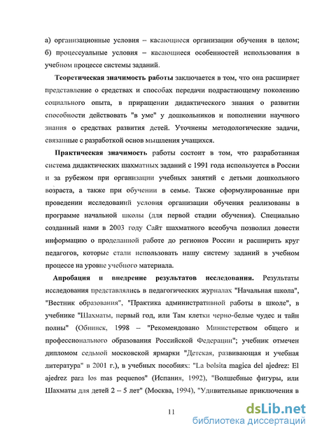 Апробация и внедрение результатов исследования. Результаты исследования представлялись в педагогических журналах "Начальная школа", "Вестник образования", "Практика административной работы в школе", в учебнике "Шахматы, первый год, или Там клетки черно-белые чудес и тайн полны" (Обнинск, 1998 — "Рекомендовано Министерством общего и профессионального образования Российской Федерации"; учебник отмечен дипломом седьмой московской ярмарки "Детская, развивающая и учебная литература" в 2001 г.), в учебных пособиях: "La bolsita magica del ajedrez: El ajedrez para los mas pequenos" (Испания, 1992), "Волшебные фигуры, или Шахматы для детей 2 — 5 лет" (Москва, 1994), "Удивительные приключения в