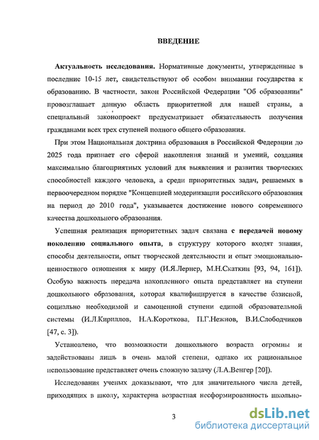 Успешная реализация приоритетных задач связана с передачей новому поколению социального опыта, в структуру которого входят знания, способы деятельности, опыт творческой деятельности и опыт эмоционально-ценностного отношения к миру (И.Я.Лернер, М.Н.Скаткин [93, 94, 161]). Особую важность передача накопленного опыта представляет на ступени дошкольного образования, которая квалифицируется в качестве базисной, социально необходимой и самоценной ступени единой образовательной системы (И.Л.Кириллов, Н.А.Короткова, П.Г.Нежнов, В.И.Слободчиков [47, с. 3]).