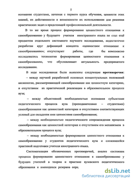 Систематизация обозначенных противоречий, анализ состояния процесса формирования ценностного отношения к самообразованию у будущих учителей в теории и практике вузовского педагогического образования и имеющихся резервов определили направление и характер