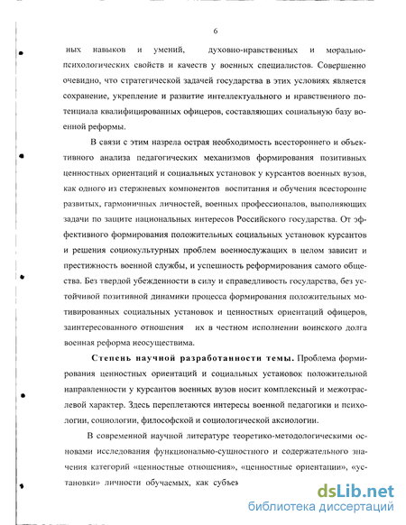 Степень научной разработанности темы. Проблема формирования ценностных ориентации и социальных установок положительной направленности у курсантов военных вузов носит комплексный и межотраслевой характер. Здесь переплетаются интересы военной педагогики и психологии, социологии, философской и социологической аксиологии.