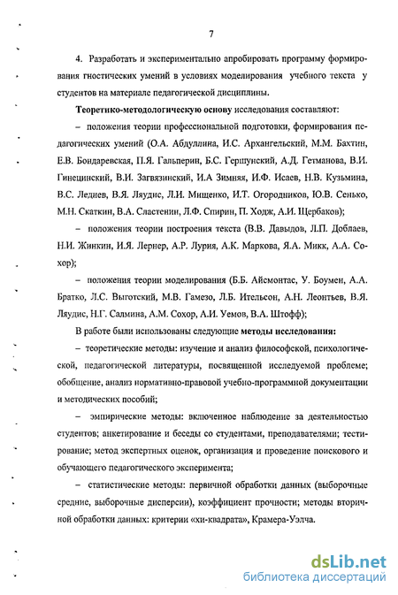 Цель диссертационного исследования заключается в определении условий моделирования учебного педагогического текста, обеспечивающих интенсивное формирование гностических умений, а именно - умения работать с текстом.