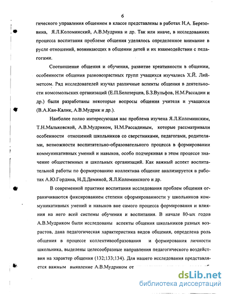 Наиболее полно интересующая нас проблема изучена Я.Л.Коломинским, Т.Н.Мальковской, А.В.Мудриком, Н.М.Рассадиным, которые рассматривали особенности отношений школьников со сверстниками, педагогами, родителями, возможности воспитательно-образовательного процесса в формировании коммуникативных умений и навыков, особо подчеркивая в этом процессе значение общественных и школьных организаций. Как важный аспект воспитательной работы по формированию коллектива общение анализируется в работах А.Ю.Гордина, Н.Д.Деминой, Я.Л.Коломинского и др.