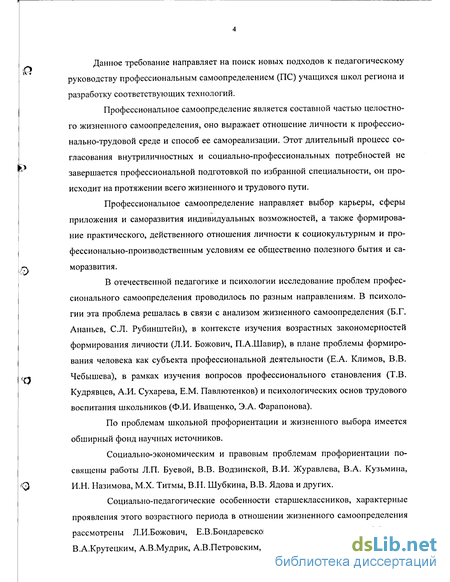 В отечественной педагогике и психологии исследование проблем профессионального самоопределения проводилось по разным направлениям. В психологии эта проблема решалась в связи с анализом жизненного самоопределения (Б.Г. Ананьев, С.Л. Рубинштейн), в контексте изучения возрастных закономерностей формирования личности (Л.И. Божович, П.А.Шавир), в плане проблемы формирования человека как субъекта профессиональной деятельности (Е.А. Климов, В.В. Чебышева), в рамках изучения вопросов профессионального становления (Т.В. Кудрявцев, А.И. Сухарева, Е.М. Павлютенков) и психологических основ трудового воспитания школьников (Ф.И. Иващенко, Э.А. Фарапонова).