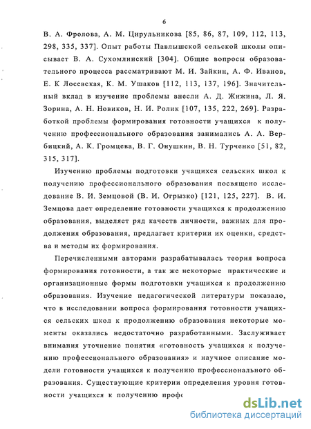 В. А. Фролова, А. М. Цирульникова [85, 86, 87, 109, 112, 113, 298, 335, 337]. Опыт работы Павлышской сельской школы описывает В. А. Сухомлинский [304]. Общие вопросы образовательного процесса рассматривают М. И. Зайкин, А. Ф. Иванов, Е. К Лосевская, К. М. Ушаков [112, 113, 137, 196]. Значительный вклад в изучение проблемы внесли А. Д. Жижина, Л. Я. Зорина, А. Н. Новиков, Н. И. Ролик [107, 135, 222, 269]. Разработкой проблемы формирования готовности учащихся к получению профессионального образования занимались А. А. Вербицкий, А. К. Громцева, В. Г. Онушкин, В. Н. Турченко [51, 82, 315, 317].