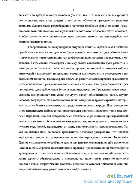 Анализ современных педагогических исследований, образовательной практики позволяет утверждать, что формирование гражданской позиции школьников рассматривается как в аспекте гражданско-правового обучения, так и в аспекте внеурочной деятельности, при этом акцент делается в пользу обучения гражданско-правовым знаниям. Однако мало разработанной остается проблема формирования гражданской позиции школьников в целостном педагогическом процессе, реализуемом в условиях образовательно-воспитательного пространства школы.