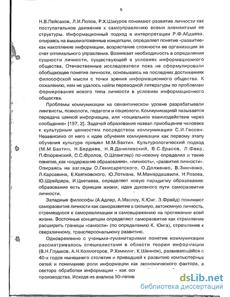 Н.В.Пейсахов, Л.И.Попов, Р.Х.Шакуров понимают развитие личности как поступательное движение к самоуправлению всеми элементами ее структуры. Информационный подход в интерпретации Р.Ф.Абдеева, опираясь на вышеизложенные концепции, определяет понятие «развитие» как накопление информации, возрастание сложности ее организации за счет оптимального управления. Возникает необходимость в определении сущности личности, существующей в условиях информационного общества. Отечественные исследователи пока не сформулировали обобщающее понятие личности, основываясь на последних достижениях философской мысли с точки зрения информационного общества. К сожалению, нам не удалось найти переводной литературы по проблемам формирования нового типа личности в условиях информационного общества.
