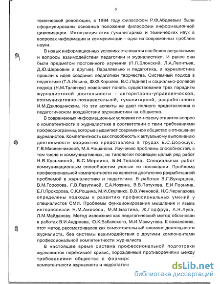 В современных информационных условиях по-новому ставится вопрос о компетентности в журналистике в соответствии с теми требованиями профессиограммы, которые выдвигает современное общество в отношении журналистов. Компетентность как способность к актуальному выполнению деятельности корректно представлена в трудах Е.С.Дорощук, Г.В.Масленниковой, М.А.Чошанова. Изучению проблемы способностей, в том числе и коммуникативных, их типологии посвящен целый ряд работ Н.В.Кузьминой, В.С.Мерлина, Б.М.Теплова. Специальных работ коммуникационным способностям ученые не посвящали. Проблема профессиональной компетентности не является достаточно разработанной проблемой в журналистике и педагогике. В работах В.Г.Бухарцева, В.М.Горохова, Г.В.Лазутиной, Е.А.Ножина, В.В.Петухова, Е.И.Пронина, Е.П.Прохорова, С.К.Рощина, М.И.Скуленко, В.В.Ученовой, Н.С.Черепахова определены подходы к развитию профессиональных умений у специалистов СМИ. Проблемы функционирования мышления и языка интересовали Н.М.Амосова, М.М.Бахтина, Ж.Годфруа, А.Н.Лука, Л.М.Майданову. Метод изложения как педагогический метод обоснован в работах В.И.Андреева, Ю.К.Бабанского, М.И.Махмутова. К сожалению, этот метод рассматривался как самостоятельный элемент деятельности журналиста, без системы взаимодействия с другими компонентами профессиональной компетентности журналиста.