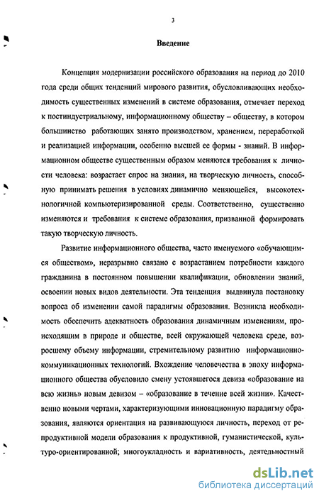 Актуальность исследования Концепция модернизации российского образования на период до 2010 года среди общих тенденций мирового развития, обусловливающих необходимость существенных изменений в системе образования, отмечает переход к постиндустриальному, информационному обществу -обществу, в котором большинство работающих занято производством, хранением, переработкой и реализацией информации, особенно высшей ее формы -знаний. В информационном обществе существенным образом меняются требования к личности человека- возрастает спрос на знания, на творческую личность, способную принимать решения в условиях динамично меняющейся, высокотехнологичной компьютеризированной среды Соответственно, существенно изменяются и требования к системе образования, призванной формировать такую творческую личность