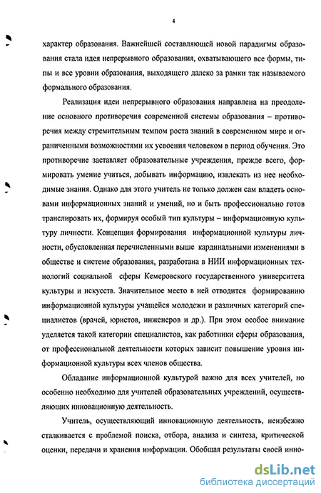 Анализу инновационной деятельности образовательных учреждений посвящены работы А В Абасова, К Ангеловски, В. И Андреева, М В Артюхова, В Н Бобрикова, Н. И. Гендиной, В А. Извозчикова, А Г. Каспржак, В С Лазарева, П С. Лернера, А М Лобок, А. М Моисеева, А О Пинского, М М Поташника, В А Сластенина, В И Слободчикова, Т М Чурековой, Т И Шамовой, Н Р Юсуфбековой и др Однако проведенные ими исследования не преследовали цель раскрыть взаимосвязь инновационных процессов в образовании с формированием информационной культуры учителя