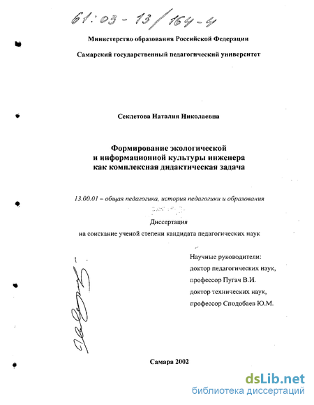 Теоретическая значимость исследования. Результаты исследования позволят осуществить более широкий подход к решению проблемы формирования экологического сознания будущих инженеров их информационной и общей культуры; расширят научные представления о механизмах педагогической деятельности, обеспечивающей интеграцию содержания высшего инженерного образования.