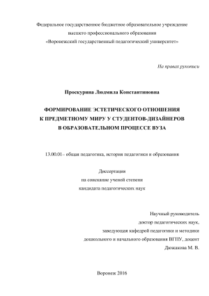 ния: «Формирование эстетического отношения к предметному миру у студентов-дизайнеров в образовательном процессе вуза».