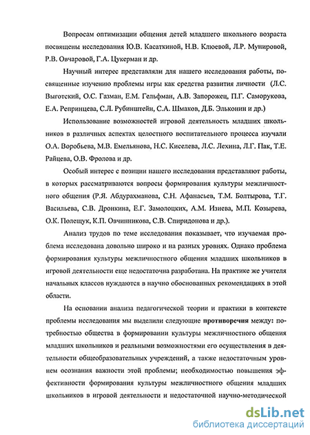 На основании анализа педагогической теории и практики в контексте проблемы исследования мы выделили следующие противоречия между: потребностью общества в формировании культуры межличностного общения младших школьников и реальными возможностями его осуществления в деятельности общеобразовательных учреждений, а также недостаточным уровнем осознания важности этой проблемы; необходимостью повышения эффективности формирования культуры межличностного общения младших школьников в игровой деятельности и недостаточной научно-методической разработанностью этой проблемы.