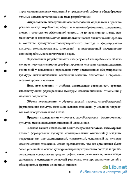 Объект исследования - образовательный процесс, способствующий формированию культуры межнациональных отношений у младших подростков в общеобразовательной школе.