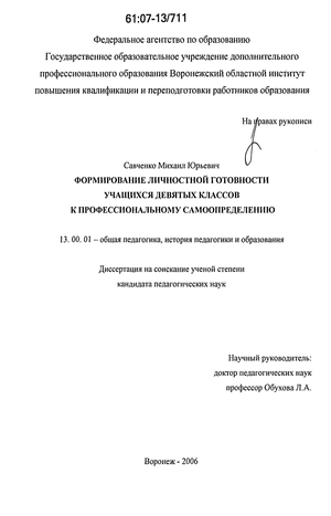 социальных педагогов Воронежского областного института повышения квалификации и переподготовки работников образования. Апробация модели исследования осуществлялась путем включения в содержание программы нормативных курсов повышения квалификации заместителей директоров по воспитательной работе, педагогов-психологов и социальных педагогов спецкурсом: «Управление профессиональным самоопределением девятиклассников». Результаты исследования докладывались на заседаниях кафедры педагогики и психологии ВОИПКРО, педагогики и связей с общественностью ВГТУ, VI межрегиональной научно-практической конференции «Информатизация учебного процесса и управления образованием. Сетевые и интернет-технологии» (Воронеж 2006г.)