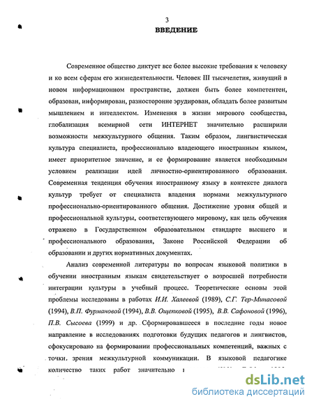 Современное общество диктует все более высокие требования к человеку и ко всем сферам его жизнедеятельности. Человек III тысячелетия, живущий в новом информационном пространстве, должен быть более компетентен, образован, информирован, разносторонне эрудирован, обладать более развитым мышлением и интеллектом. Изменения в жизни мирового сообщества, глобализация всемирной сети ИНТЕРНЕТ значительно расширили возможности межкультурного общения. Таким образом, лингвистическая культура специалиста, профессионально владеющего иностранным языком, имеет приоритетное значение, и ее формирование является необходимым условием реализации идей личностно-ориентированного образования. Современная тенденция обучения иностранному языку в контексте диалога культур требует от специалиста владения нормами межкультурного профессионально-ориентированного общения. Достижение уровня общей и профессиональной культуры, соответствующего мировому, как цель обучения отражено в Государственном образовательном стандарте высшего и профессионального образования, Законе Российской Федерации об образовании и других нормативных документах.