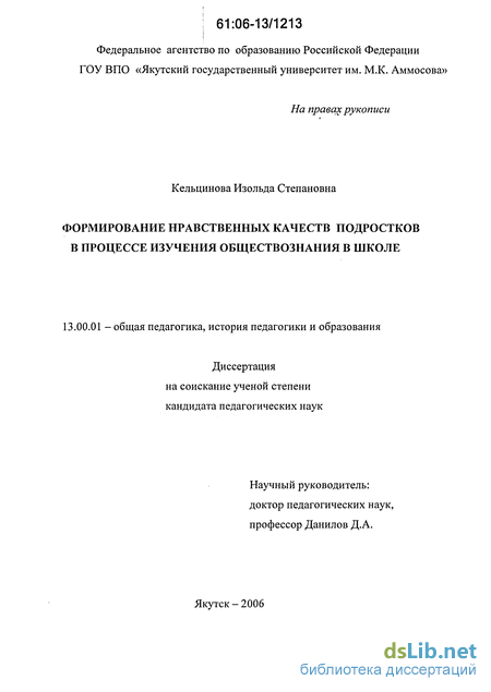 Общепедагогическое и практическое значение, актуальность проблемы, теоретическая значимость, недостаточная практическая разработанность определили выбор темы данного диссертационного исследования «Формирование нравственных качеств подростков в процессе изучения обществознания в школе».