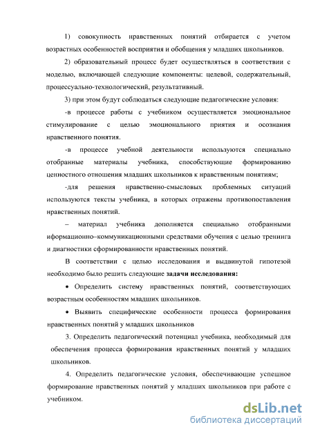 Вместе с тем, на сегодняшний день недостаточно раскрыта сущность процесса формирования нравственных понятий у младших школьников, отсутствует единый подход к пониманию этого процесса, остаются малоизученными вопросы потенциальных возможностей учебника в процессе формирования нравственных понятий у младших школьников, хотя имеются разработки теории учебника, отражающие структуру, основные параметры, функции учебника (В.Г. Бейлинсон, В.П. Беспалько, Д.Д. Зуев, В.В. Краевский, И.Я. Лернер, В.Н. Ляхов, Я.А. Микк и др.)