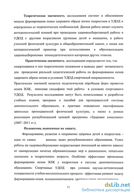 Теоретическая значимость исследования состоит в обосновании модели формирования основ здорового образа жизни подростков в УДОД и определении ее педагогических особенностей. Данная работа может служить методологической основой при проведении здоровьесберегающей работы в УДОД с другими возрастными группами детей и молодежи, в работе учителей физической культуры в общеобразовательной школе, а также как методологический ориентир при использовании в образовательном здоровьесбережении этнопедагогического материала других этносов.