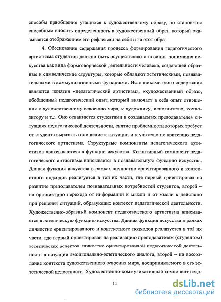 4. Обоснование содержания процесса формирования педагогического артистизма студентов должно быть осуществлено с позиции понимания искусства как вида формотворческой деятельности человека, создающей образные и символические структуры, которые обладают эстетическими, познавательными и коммуникативными функциями. Источниками этого содержания являются понятия «педагогический артистизм», «художественный образ», обобщенный педагогический опыт, который включает в себя опыт отношения к художественному освоению мира, к художнику, исполнителю, композитору и т.д. Оно осваивается студентами в создаваемых преподавателем ситуациях педагогической деятельности, снятие проблемности которых требует от студента выразить отношение к ситуации и к учителю по критерию педагогического артистизма. Структурные компоненты педагогического артистизма «вписываются» в функции искусства. Когнитивный компонент педагогического артистизма вписывается в познавательную функцию искусства. Данная функция искусства в рамках личностно ориентированного и контекстного подходов реализуется в той их части, где первый ориентирован на развитие преподавателем познавательных потребностей студентов, второй — на организацию перехода от информации к мысли и от мысли к действию при решении ситуаций, образующих контекст педагогической деятельности. Художественно-образный компонент педагогического артистизма вписывается в эстетическую функцию искусства. Данная функция искусства в рамках личностно ориентированного и контекстного подходов реализуется в той их части, где первый ориентирован на реализацию преподавателем (студентом) эстетических аспектов личностно ориентированной педагогической деятельности в ситуации эмоционально-эстетического диалога, второй - на воссоздание контекста художественного освоения мира, воспринимаемого в его эстетической целостности. Художественно-коммуникативный компонент педа-
