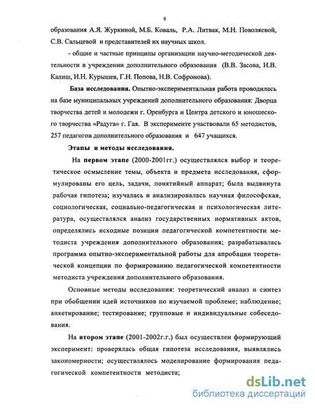 База исследования. Опытно-экспериментальная работа проводилась на базе муниципальных учреждений дополнительного образования: Дворца творчества детей и молодежи г. Оренбурга и Центра детского и юношеского творчества «Радуга» г. Гая. В эксперименте участвовали 65 методистов, 257 педагогов дополнительного образования и 647 учащихся. Этапы и методы исследования. На первом этапе (2000-2001гг.) осуществлялся выбор и теоретическое осмысление темы, объекта и предмета исследования, сформулированы его цель, задачи, понятийный аппарат; была выдвинута рабочая гипотеза; изучалась и анализировалась научная философская, социологическая, социально-педагогическая и психологическая литература, осуществлялся анализ государственных нормативных актов, определялись исходные позиции педагогической компетентности методиста учреждения дополнительного образования; разрабатывалась программа опытно-экспериментальной работы для апробации теоретической концепции по формированию педагогической компетентности методиста учреждения дополнительного образования.