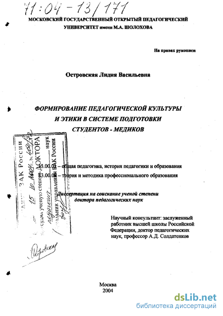 Объект исследования - процесс подготовки студентов в высшей медицинской школе по основам педагогической культуры и профессиональной этики, адекватным целям медицинского образования.