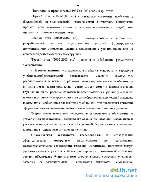 рассматриваемая в контексте развития личности; выявлены особенности влияния организации совместной деятельности семьи и школы в малых группах на формирование положительного отношения к учению у младших школьников; выявлены уровни развития самообразовательных умений младших школьников, необходимые для работы с учебной книгой; определены критерии сформированности позитивного отношения младших школьников к учению.
