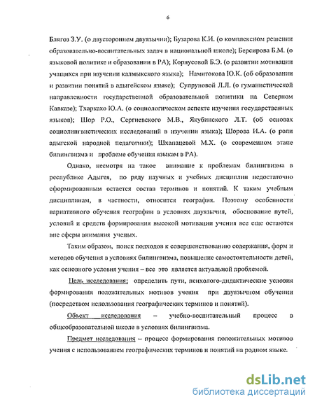 Однако, несмотря на такое внимание к проблемам билингвизма в республике Адыгея, по ряду научных и учебных дисциплин недостаточно сформированным остается состав терминов и понятий. К таким учебным дисциплинам, в частности, относится география. Поэтому особенности вариативного обучения географии в условиях двуязычия, обоснование путей, условий и средств формирования высокой мотивации учения все еще остаются вне сферы внимания ученых.
