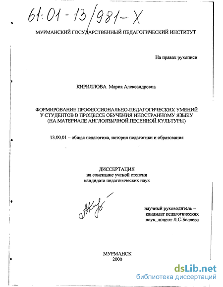 С учетом рассмотренных факторов был сделан выбор темы диссертационного исследования: «Формирование профессионально-педагогических умений студентов в процессе обучения иностранному языку, (на материале англоязычной песенной культуры)».