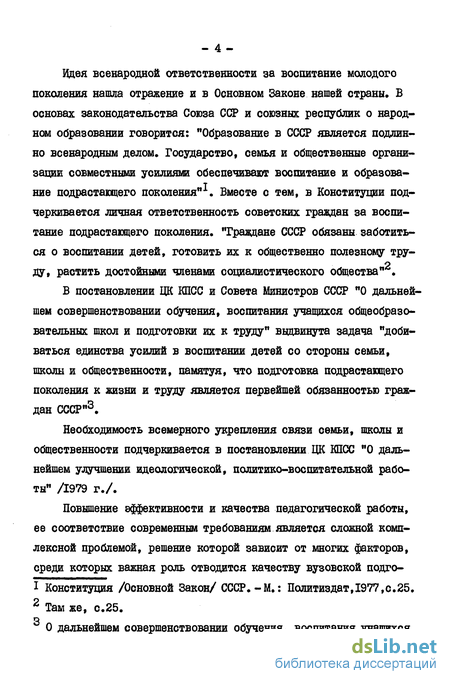 В постановлении ЦК КПСС и Совета Министров СССР "О дальнейшем совершенствовании обучения, воспитания учащихся общеобразовательных школ и подготовки их к труду" выдвинута задача "добиваться единства усилий в воспитании детей со стороны семьи, школы и общественности, памятуя, что подготовка подрастающего поколения к жизни и труду является первейшей обязанностью граждан СССР"3.