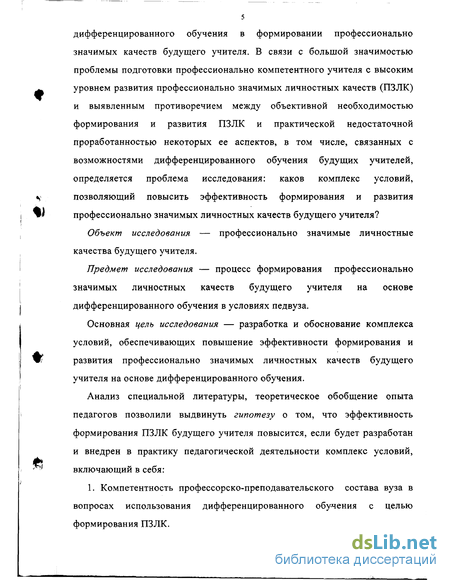 Вместе с тем в современной педагогической науке недостаточно работ, связанных с выявлением и обоснованием педагогических, психолого-педагогических, психологических, методических и др. условий формирования ПЗЛК, анализом возможности использования потенциала дифференцированного обучения в формировании профессионально значимых качеств будущего учителя. В связи с большой значимостью проблемы подготовки профессионально компетентного учителя с высоким ^ уровнем развития профессионально значимых личностных качеств (ПЗЛК) и выявленным противоречием между объективной необходимостью формирования и развития ПЗЛК и практической недостаточной проработанностью некоторых ее аспектов, в том числе, связанных с возможностями дифференцированного обучения будущих учителей, определяется проблема исследования: каков комплекс условий, *5 позволяющий повысить эффективность формирования и развития * профессионально значимых личностных качеств будущего учителя?