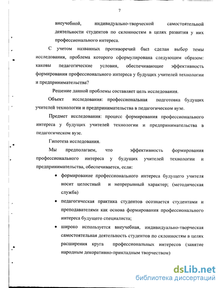 Предмет исследования: процесс формирования профессионального интереса у будущих учителей технологии и предпринимательства в педагогическом вузе.