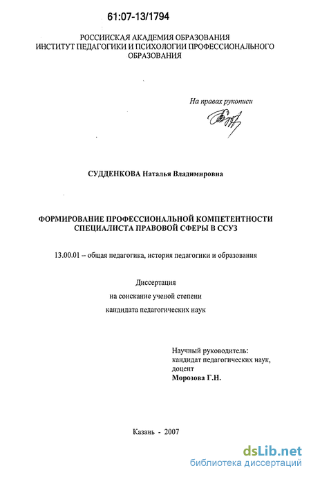 разработке научно-методического сопровождения формирования профессиональной компетентности специалиста правовой сферы в ссуз.
