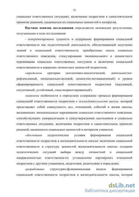 -выявлены особенности и определено содержание процесса формирования социальной ответственности подростков в жизнедеятельности школы, который представляет собой совокупность дел, отношений, событий в жизни школы, вызывающих эмоциональные переживания социально ответственного поведения, способствующих самореализации и самоутверждению школьников в социально ответственных ситуациях, включению подростков в самостоятельное принятие решений, касающихся социальных ценностей и интересов учащихся;