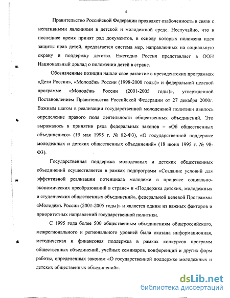 Обозначенные позиции нашли свое развитие в президентских программах «Дети России», «Молодёжь России (1998-2000 годы)» и федеральной целевой программе «Молодёжь России (2001-2005 годы)», утвержденной Постановлением Правительства Российской Федерации от 27 декабря 2000г. Важным шагом в реализации государственной молодежной политики явилось определение правого поля деятельности общественных объединений. Это выражалось в принятии ряда федеральных законов - «Об общественных объединениях» (19 мая 1995 г. № 82-ФЗ), «О государственной поддержке молодежных и детских общественных объединений» (18 июня 1995 г. № 98-ФЗ).