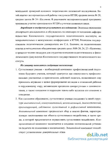 Хотя исследованию внушения посвящено достаточно работ в области медицины, социологии, психологии и физиологии, исследователи-педагоги мало обращались к данной проблеме. Правда, ряд ученых обращает внимание на огромную силу, которой обладает слово человека, особенно авторитетного в глазах слушателя. Упоминание об этом можно найти в работах классиков педагогики (Дж. Локк, Ж.-Ж. Руссо, Н.А. Добролюбов, П*П. Блонский, В.М. Бехтерев, А.С. Макаренко, В,А. Сухомлинский и др.), а также в работах современных авторов (И.Е, Шварц, Г. Лозанов, АР. Ковалев, А.А. Дубровский Л.В, Гашева, Д(Е. Новоселова и др.)- Однако исследования, в которых бы разрабатывались технологии и условия обучения студентов педагогических вузов применению внушения в учебно-воспитательном процессе, отсутствуют. До сих пор не разработано определение суггестивных умений (СУ)-ключевого понятия проблемы, отсутствует описание их структуры, методов и условий формирования.