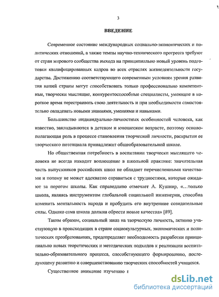 Необходимость разработки проблемы формирования творческих способностей учащихся старшего школьного возраста обусловлена современными тенденциями социально-экономического развития нашей страны, повышением требований к научной и практической подготовке современного человека. Обществу требуются духовно раскрепощенные люди, способные творчески и независимо мыслить, активно участвовать в создании материальных и культурных ценностей, в управлении производством, в совершенствовании политических и общественных отношений. В связи с этим, в качестве приоритетных, документально закрепленных в «Концепции модернизации Российского образования на период до 2010 года» [84], целей современного воспитательно-образовательного процесса выдвигаются цели развития творческой личности ребенка, а предметные знания и умения рассматриваются как средство их достижения.