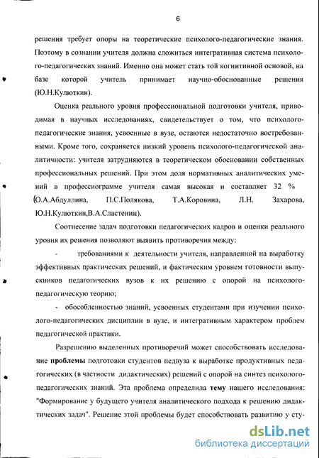 Разрешению выделенных противоречий может способствовать исследование проблемы подготовки студентов педвуза к выработке продуктивных педагогических (в частности дидактических) решений с опорой на синтез психолого-педагогических знаний. Эта проблема определила тему нашего исследования: "Формирование у будущего учителя аналитического подхода к решению дидактических задач". Решение этой проблемы будет способствовать развитию у сту- дентов аналитических умений, осознанному владению ими широким арсеналом современных методов и форм организации обучения и, в конечном итоге, формированию умения разрабатывать стратегию решения дидактических задач с опорой на теоретические психолого-педагогические знания. В этом состоит актуальность предлагаемого исследования.