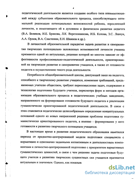 лений; принципы и методы системного подхода (П.К. Анохин, В.Г. Афанасьев, Э. Г. Юдин и др.); основные положения научно-теоретических подходов к процессу профессионально-личностного становления будущего педагога: личностно-ориентированного (В.А. Болотов, М.Н. Костикова, В.В. Сериков и др.), индивидуально-творческого (В.И. Андреев, И.Ф. Исаев, В.А. Кан-Калик, Н.Д. Никандров и др.), культурологического (Е.В. Бондаревская, Т.Ф. Бело-усова, В.А. Сластенин и др.), деятельностного (И.Я. Лернер, П.И. Пидкаси-стый, М.Н. Скаткин и др.), контекстного (А.А. Вербицкий и др.); концепции целостного процесса формирования личности (Б.Г. Ананьев, М.С. Каган, Л.С. Выготский, А.Н. Леонтьев и др.); теории психологической готовности человека к деятельности (М.И. Дьяченко, Н.Д. Левитов, К.К. Платонов, А.А. Смирнов и др.) и профессиональной готовности к педагогической деятельности (К.М. Дурай-Новакова, С.А. Николаенко, В.А. Сластенин, РГ. Шакирова и др.); теории педагогического творчества (ВИ Загвязинский, ВА Кан-Калик, НД Никандров, ММ Поташник и др.); психологические и педагогические концепции, раскрывающие категорию "творческий потенциал" (ТГ. Браже, MB. Колосова, В.Ф. Овчинников и др.); концепция развития творческого потенциала личности в системе высшего образования (ГІФ. Кравчук, В.Г. Рындакидр.); теория творческого саморазвития личности (В Л Андреев, ДБ. Богоявленская, ЯЛ. Пономарев и др.).