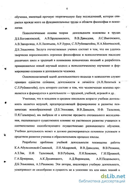 Актуальная задача современной школы заключается в том, чтобы организовать такое образование, которое ориентируют на психическое развитие ученика. В связи с этим образовательные аспекты смещаются с усвоения основ учебных предметов на развитие личности обучающегося. Перестройка школьного образования заключается в переходе к развивающему обучению, центральной задачей её является формирование полноценного субъекта учебной деятельности. Это обстоятельство продиктовало необходимость вычленения из общего комплекса проблем развивающего обучения проблему формирования учебной деятельности в ней. Понятия "развивающее обучение" и "учебная деятельность" находятся во взаимосвязи и соподчиненности. В своем исследовании мы исходим из основополагающего принципа, выдвинутого в отечественной педагогической науке и практике В.В.Давыдовым, согласно которому успешный переход современной системы образования к развивающему обучению возможен при условии организации учебного процесса на деятельностной основе при параллельном осуществлении целенаправленного формирования у учащихся деятельности учения [58, 84, 203].