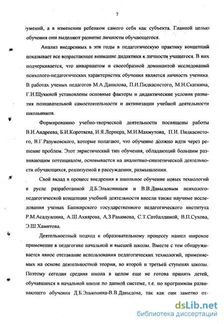И.С. Якиманская развивающее обучение связывает с развитием умственной активности школьников в процессе усвоения знаний. Умственная активность определяется ею как " сложное психическое образование, формируемое под влиянием разнородных динамических факторов"[226, с.75]. По ее мнению, через развитие активности происходит становление важных качеств личности: умения организовать свой труд, критически осмыслить и оценить, стремление усовершенствовать его, используя для этого рациональные способы. Развитие мышления школьников, считает она, способствует выделению базисных идей, объединяющих конкретные знания и облегчающие понимание учебного материала [226, с.13].
