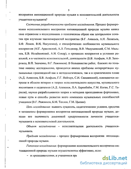 Состояние разработанности проблемы исследования. Процесс формирования исполнительского восприятия интонационной природы музыки нашел свое отражение в исследованиях о психическом образе как центральном понятии при изучении закономерностей восприятия (Б.Г. Ананьев, А.Н. Леонтьев, Б.Ф. Ломов, В.Н, Носуленко), о специфических особенностях музыкального восприятия (М.Г. Арановский, А.Л. Готсдинер, В.В. Медушевский, СМ. Мальцев, Е.В. Назайкинский, А.Н. Сохор), о процессах восприятия в условиях реальной, и в частности исполнительской, деятельности (Б.В. Асафьев, А.В. Запорожец, В.П. Зинченко, В.Г. Ражников). В большинстве работ, близких по тематике нашему исследованию, проводится анализ проблемы интерпретации музыкальных произведений как в методологическом, так и в практическом плане (А.Д. Алексеев, Б.В. Асафьев, Г.Г. Нейгауз, СИ. Савшинский), освещаются вопросы в области истории и теории исполнительского искусства, музыкального воспитания и педагогики (А,Д. Алексеев, Л.А. Баренбойм, Г.М. Коган, Г.С Тарасов), научно разрабатываются теория и методика преподавания фортепиано, новые пути и способы развития всего комплекса музыкальных способностей учащихся (В.Г. Ражников, Б.М. Теплов, Г.М. Цыпин).