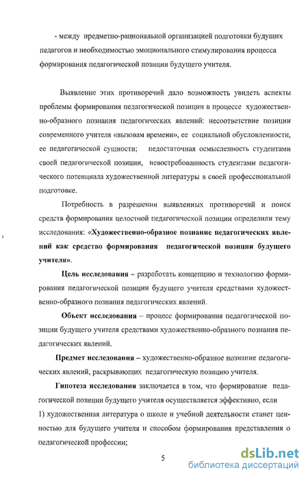 Нами изучено большое количество педагогических исследований, рассматривающих подготовку будущего педагога (Галицких Е.О., Гогобе-ридзе А.Г., Гребенкина Л.К., Лузина Л.М., Роботова А.С, Родионова Н.Ф., Сенько Ю.В., Сластенин В,А. и др.), и выявлено, что формирование педаго-гическкой позиции очень редко становится целью и результатом реализации исследовательского замысла.