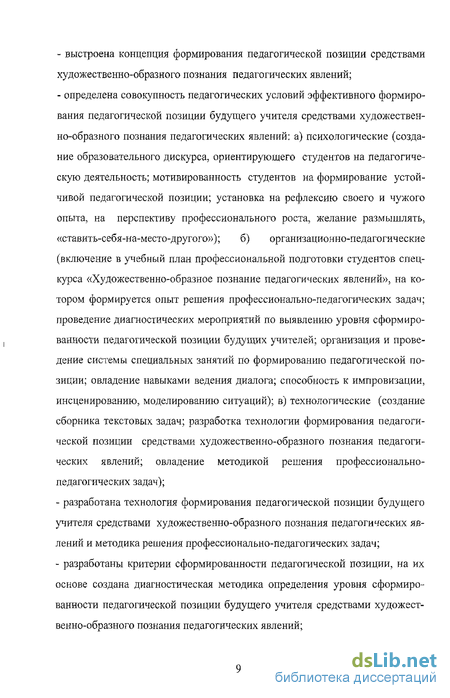 3. Условиями эффективного формирования педагогической позиции средствами художественно-образного познания педагогических явлений являются следующие; а) психологические (создание образовательного дискурса, ориентирующего студентов на педагогическую деятельность; мотивированность студентов на формирование устойчивой педагогической позиции; установка на рефлексию своего и чужого опыта, на перспективу профессионального роста, желание размышлять, «ставить-себя-на-место-другого»); б) организационно-педагогические (включение в учебный план профессиональной подготовки студентов спецкурса «Художественно-образное познание педагогических явлений», на котором формируется опыт решения профессионально-педагогические задачи; проведение диагностических мероприятий по выявлению уровня сформироваш-юсти педагогической позиции; овладение навыками ведения диалога; способность к импровизации, инсценированию, моделированию ситуаций); в) технологические (создание сборника текстовых задач; разработка технологии формирования педагогической позиции средствами художественно-образного познания педагогических яв-