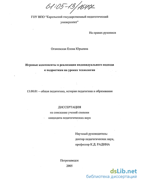 Диссертация посвящена проблеме использования игровых компонентов в реализации индивидуального подхода к учащимся на уроках технологии.